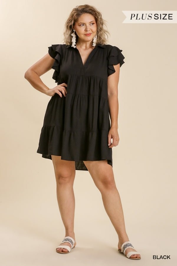 This Umgee dress features a linen blend fabric, split neckline, short ruffled sleeves, and a tiered body.